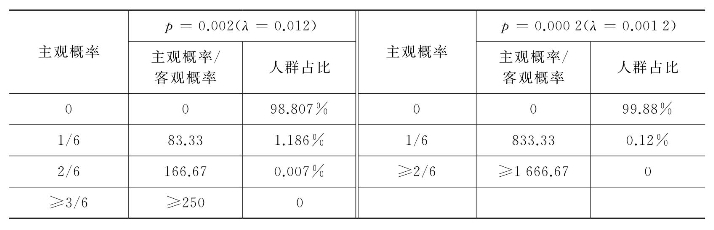 表5-6 “主观概率/客观概率”的分布规律(客观概率p=0.002、0.000 2)