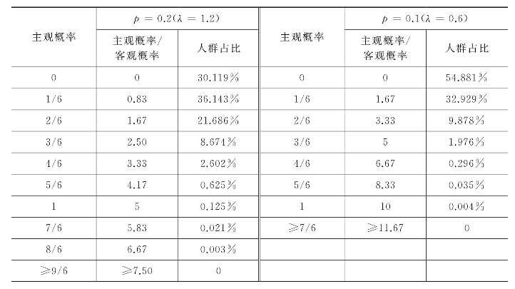 表5-4 “主观概率/客观概率”的分布规律(客观概率p=0.2、0.1)