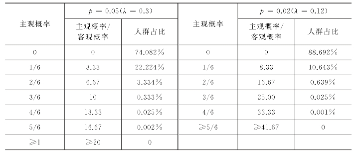 表5-5 “主观概率/客观概率”的分布规律(客观概率p=0.05、0.02)