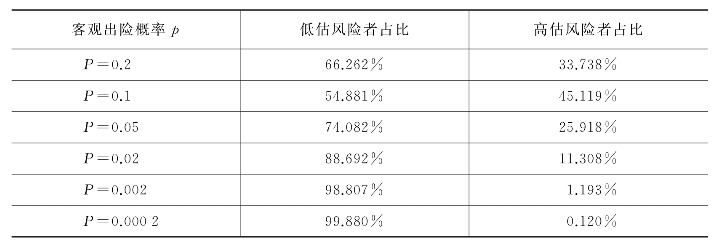 进一步地,从表5-4、表5-5、表5-6可以计算得到不同客观概率水平下的低估风险者占比、低估程度、高估风险者占比和高估程度。低估风险占比和高估风险者占比很容易计算,但高估程度和低估程度不容易用一个指标描述。