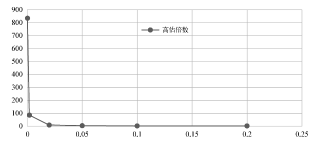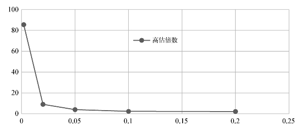 图5-6 高估倍数随客观概率的变化规律(删除客观概率为0.002的情形)