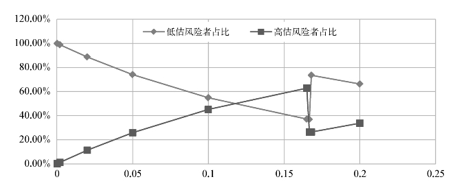 第二,随着客观出险概率的降低,低估风险者占比逐渐增加,高估风险者占比逐渐减少;
