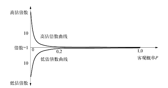 当客观概率大于0.1后,高估概率者占比和低估概率者占比都快速逼近50%,高估倍数和低估倍数都快速接近于1(倍)。
