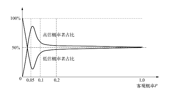 当客观概率为1时,不确定性消失了,人们都变得能够准确评估风险了,高估概率者占比和低估概率者占比均变为50%。