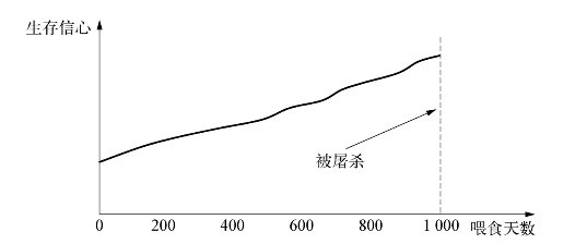 塔勒布在《黑天鹅》中举了一个非常有趣的案例:想象一只每天都有人喂食的火鸡。每次喂食都使它相信生命的一般法则就是每天得到“为它的最大利益着想”的友善人类的喂食。直到第1000天时,在感恩节前的星期三下午,一件意料之外的事情发生了,它被宰杀烧烤后端上了餐桌。事实上,这只火鸡的思维与上述蹩脚的司机非常类似,被杀前,随着友好喂食天数的增加,火鸡越来越相信友好人类第二天会继续来喂食。虽然被宰杀越来越临近,它却感到越来越安全,在第1000天时,火鸡的安全感达到了历史最高值,随后却被宰杀了!如图5-10所示。