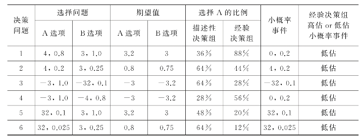更重要的是,在经验决策条件下,被试普遍低估了小概率风险。例如,就问题1而言,描述性决策组多数人选择B(3,1.0),而经验性决策组多数选择了A(4,0.8),原因很可能是经验性决策组在抽样过程中,多数被试均未抽到小概率事件(0,0.2),进而低估了小概率事件(0,0.2)的存在性,进而选择了A。再比如问题3,描述性决策组多数人选择了A(-3,1.0),而经验性决策组多数选择了B(-32,0.1),原因很可能是经验性决策组在抽样过程中,多数被试均未抽到小概率事件(-32,0.1),导致忽略或低估了小概率事件(-32,0.1)的存在性,进而选择了B。