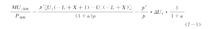 显然,表示多花1元钱购买保险带来的效用,ΔU′1表示多花1元钱购买其他商品带来的效用,只有当前者大于后者,即满足式(7-3)时,决策者才会购买保险。而且,决策者会一直增加保额,直到两者相等,即满足式(7-4)为止。