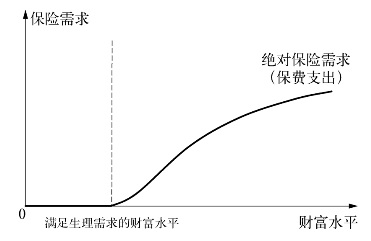 综合而言,由于财富水平很低时贴现率很大,导致财富水平很低的人们几乎没有任何保险需求,当收入升高到一定程度后,个体产生了保险需求,此后,随着财富增长,保费支出(绝对保险需求)逐渐增大,如图7-10所示,但“保费支出/净资产”(相对保险需求)应该变化不大。