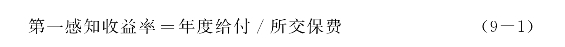 对于保险公司销售的5年期以上的长期储蓄性保险,如长期年金保险,投资者往往将自己所交保费视为存到保险公司的本金,将保险公司给付的年度生存金理解为利息给付,由此,长期储蓄性保险的感知收益率常被投资者按照公式(9-1)进行简化计算: