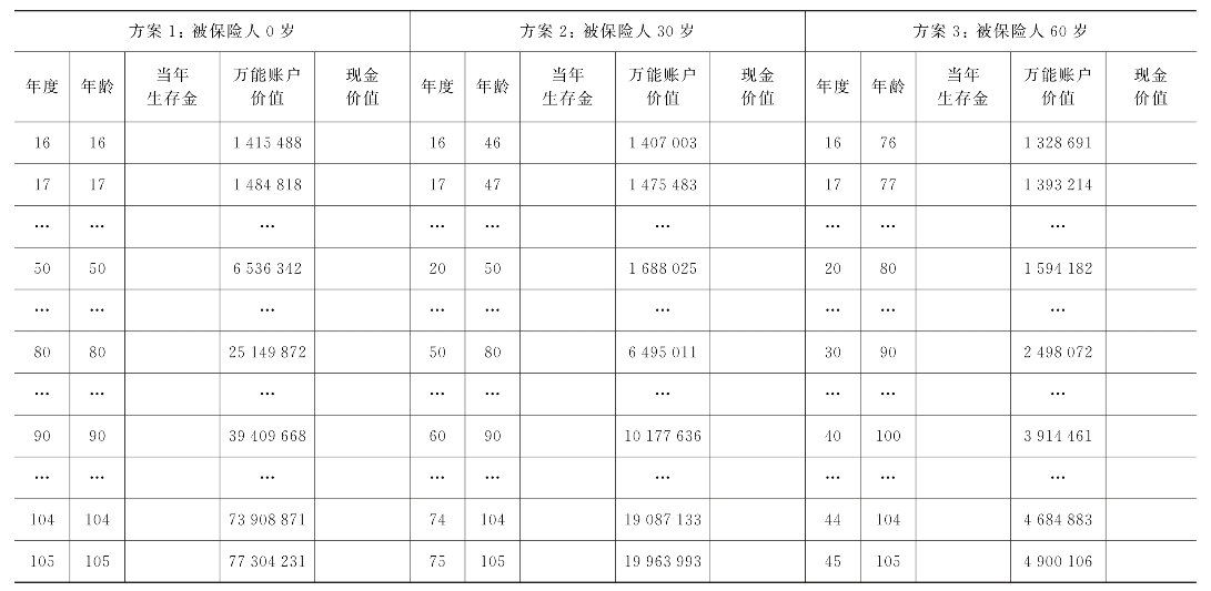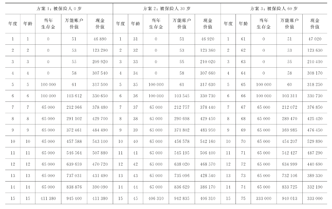 表9-2 三个年龄被保险人的“普通年金+终身万能险”保单利益演示表(万能账户年化利率4.5%)