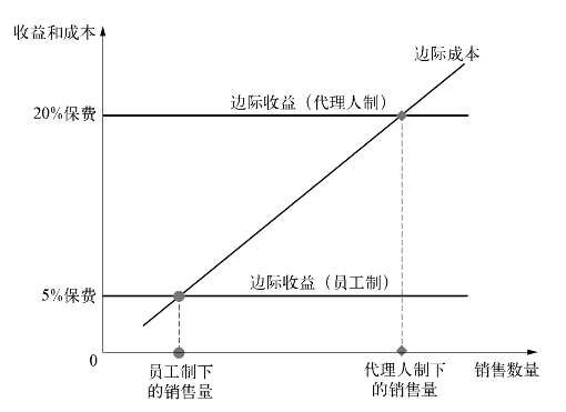 无论采取何种制度,销售员都会追求自身利益最大化,并通过选择边际收益等于边际成本时的销量来实现。显然,对销售员而言,在边际成本变化规律不变的条件下,相对于员工制,代理人制下的边际收益大幅增加(从保费的5%增加到了20%)。这意味着,相对于员工制,在代理人制度下,同样的销售员会卖出更多的保险。如图12-1所示,代理人制度下的均衡点比员工制下的均衡点要靠右得多,销售数量大幅增加。