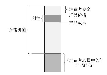 如图12-2所示[15],消费者心目中的产品价值远低于产品价格,于是,销售员通过向客户提供营销价值,使得客户获得总价值提升为“产品价值+营销价值”,超过了“产品价格”,进而触发了购买行为。此时,消费者获得了正的消费者剩余(=产品价值+营销价值-产品价格),公司则获得了利润(=产品价格-产品成本)。