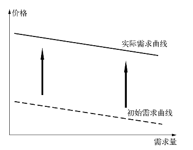 此外,考虑到消费者非理性导致的需求疲弱,起初,保险公司面临的向右下方倾斜的需求曲线是非常靠下的。面对如此靠下的需求曲线,保险公司实施了行为学产品设计、捆绑销售、买就送、保险代理人制度、创造营销价值等“供给改变需求”策略,竭力将保险需求曲线向上推动。最终,实际需求曲线远高于消费者主观固有的初始需求曲线,如图12-4所示。