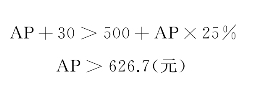 假定,对于某种风险成本已知的保险业务,假定每笔保险业务都是同质的,每笔保险业务的平均期望风险成本ARC为500元,单位保费的变动营运成本率VOCR为25%,每笔业务带来的投资收益为30元,营业收入为保费收入与投资收益之和,每笔业务的保费为AP。则依据“停产点”定价法,需要满足“营业收入>可变成本(风险成本+变动营运成本)”,即