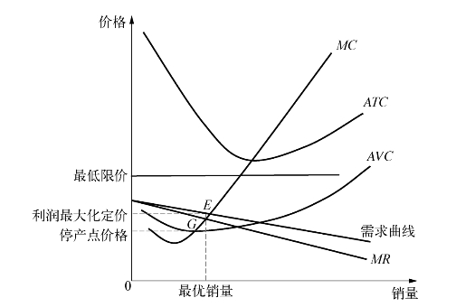 从图中可以看出,公司最优定价(或利润最大化定价)高于G点对应的停产点价格,但高过的程度不大,而且,公司最优定价远低于平均总成本,公司是亏损的。但是,这个亏损额对公司而言是最优的,公司实现了亏损最小化(或利润最大化),这是由其市场竞争力所决定的最好结果。