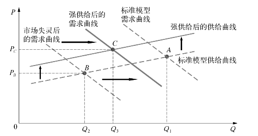 如图16-4所示(请读者结合图16-3看),强供给使“市场失灵后的需求曲线”向右移动到“强供给后的需求曲线”,同时使“标准模型供给曲线”向上移动到“强供给后的供给曲线”,使市场均衡点从B移动到C,市场交易量从Q2扩大到了Q3,市场价格从PB到上升到了PC。