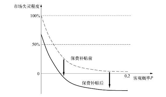 那么,保费补贴能否战胜低估风险的负面影响呢?这取决于保险风险出险概率的高低,因为,保险风险出险概率越低,低估风险者占比越大且低估程度越大,导致更多人不愿购买保险,如图16-1所示。由此可以推断,在保费补贴水平一定的条件下,对市场失灵程度的削减程度如图16-5所示,显示为市场失灵程度曲线向下移动。