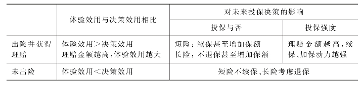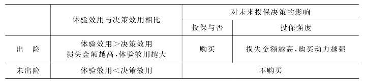 依据前面的分析,投保决策完成后,消费者在保险期限内的体验效用(实际就是记忆效用)与决策效用可能不同,这自然会对其未来投保决策产生影响。具体而言,体验效用对投保决策的影响有两种情形:一种是买了保险后,在保险期限内产生的体验效用对其未来投保或续保决策的影响;二是在决策时选择不买保险后,其体验效用对未来投保决策的影响。