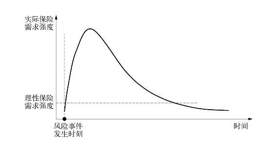 如果其他变量不变,感知风险的变化自然会导致保险需求的变化。如图17-5所示,在保险事故刚刚发生后的一段时间里,随着经济损失和精神伤害不断显现,个体的感知风险逐渐增加,个体会严重高估风险,此时的保险需求非常强烈,实际保险需求强度远高于理性保险需求强度。随着时间推移,个体进入适应过程,感知风险会逐渐下降,实际保险需求强度也逐渐下降。最终,个体的感知风险会恢复到风险事故发生之前的水平,保险需求强度也会恢复到风险事故发生之前的状态。当然,如果风险事件非常严重,使个体有了刻骨铭心的感受,则适应期会非常长,或者说,个体会长期处于高估风险和保险需求强度较高的状态。