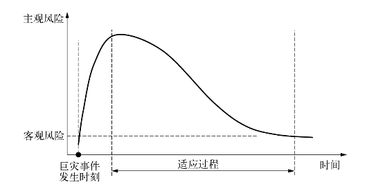 在意料之外的巨灾事件发生后,随着核实的应赔付金额逐渐上升,核保师的主观风险逐渐上升,当该事件导致的巨额赔付基本核定后,核保师的主观风险达到了最高点。之后,随着时间推移,核保师的主观风险会逐渐下降,但很可能会比普通人经历风险事件后的下降速度要慢,因为这是他的职业所在,这种风险评估是他的日常工作,会很容易让他回想起曾经发生的巨灾事件。最终,在长期未发生同类风险事件的情况下,核保师的主观风险会下降到最低水平,但这一最低水平会高于意料之外的巨灾事件发生前的主观风险水平[3]。