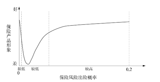 既然保险产品形象与保险供给强度呈反比关系,而保险供给强度与保险风险发生概率是如图17-8所示的偏态倒V形关系,则保险产品形象与承保风险出险概率就呈偏态正V形关系,如图17-9所示。