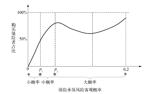 如图7-6“购买者占比函数”所示,“小概率、大损失风险”位于该函数的最左侧,保险购买者占比低于50%,而且出险概率越低,保险购买者占比越低。