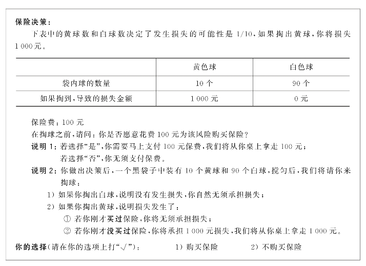 实际情况也是如此。我们曾经在一次投保决策实验中招募了43名研究生被试,要求每名被试针对24种风险场景独立做出是否购买保险的决策(被试面临的每个风险的保险决策都类似于图20-1,当然,每个风险的实际参数会有所不同)。购买保险和保险金赔付都采用代币进行交易,但被试的所有代币会在实验结束时都以一定的比例兑换人民币,是“真刀实枪”的保险交易(郭振华、朱少杰,2014)。当然,本实验并不完全符合现实世界的投保决策,因为在实验中,被试投保所需保费,在正式实验前已由实验组织者通过要求被试参加测验的方式提前发给了被试,被试面临较为虚弱的投保预算约束。