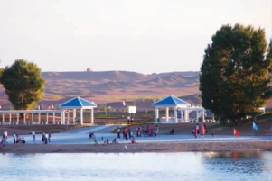 金沙湖位于金塔县城西南隅的夹山北麓,原名解放村水库,与鸳鸯湖隔山为邻,故称“母子湖”。此地原先叫三道岭马场,1969 年10月,金塔县在此修筑水库,1971 年6 月竣工。是一座以蓄水灌溉为主,兼有防洪、发电、养殖等综合效益的中型水库。近年来,金塔县大力发展旅游业,为了旅游开发的需要,解放村水库易名为金沙湖。
