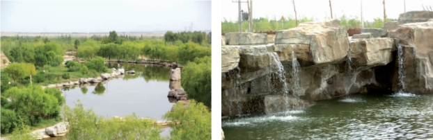 清泽溪,位于金鼎湖西北侧,是金鼎湖的配套工程,占地面积30 万平方米,含清幽曲径、润泽万民、溪水长流之意。它是集“山水金塔,人文金塔”的文化内涵与自然、和谐、文明的发展理念相融合,形成了以清泽溪为轴线的水文景观,以溪边绿化为主体的绿地景观,以溪、潭、瀑,桥、闸、廊为点缀的建筑景观。景区内绿化采取乔灌花草结合,带片网景配套,栽植了以油松、落叶树、樟子松、云杉、刺柏、祁连圆柏、馒头柳、垂柳、金丝柳、国槐、刺槐、桃树、杏树、白腊、胡杨、沙枣、红柳、花棒、毛条为主的各类乔灌木10 多万棵。初步形成了集防风固沙、旅游观光为一体的生态绿化林体系。