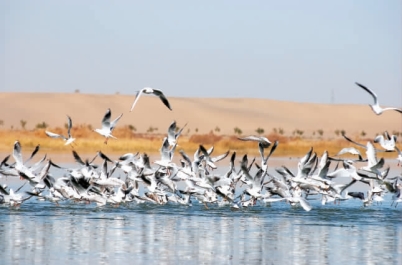 入夏,金塔县北海子湿地内水草摇曳、波光粼粼、候鸟翻飞,在大漠戈壁的映衬下形成了浑然天成的生态美景。走进北海子景区,首先映入眼帘的是一望无际的蔚蓝湖面,与岸边的芦苇荡和远处的青山相映成趣,形成了水天一色的奇景。湖泊与沙丘共存,蓝天与碧水相接,集大漠戈壁、芦苇、山峰、湖泊于一体,构成了一道独特的自然景观。