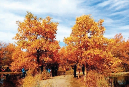 在金塔县,有大片天然胡杨林。它耐盐碱,抗风沙,适宜在极端干旱的条件下生长。