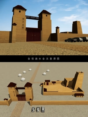 汉长城从肩水金关南边过来与烽燧相接,然后向北边一直延伸至额济纳河的东岸边。关门是金关的主体建筑,设在经过烽燧北部的长城上。