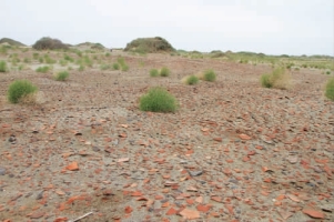 东部风蚀台地上有直径15 米的冶铜址,地表有大量铜矿石,碎铜块及碳釉结块。
