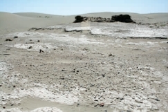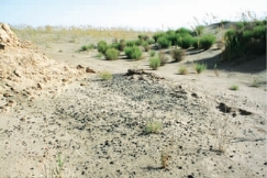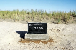 二道梁遗址,位于大庄子乡牛头湾村东北13.7 千米处沙丘环绕之中的一处风蚀台地之上。遗址分布呈长方形,南北长300 米,东西宽200 米,总面积60000 平方米。遗址四周被新月形沙丘环绕,北部有灌丛沙丘。地表散见有大量夹砂红陶片及少量红衣黑纹彩陶片,刮削器、矿石、黑釉渣等物。遗址中心南北宽30 米,东西长50 米的台地上有一南北宽2米,东西长4 米的冶铜址,冶铜址东南10 米处有一灰堆,呈圆形,直径3米,其东南20 米处另有一处灰堆,呈圆形,直径10 米,地表有铜锈块、炭烧结块等。据采集标本的特征分析,为夏、商时代齐家文化、四坝文化遗存。