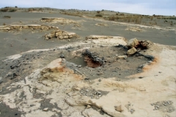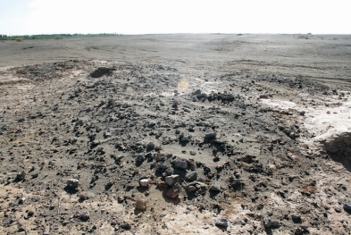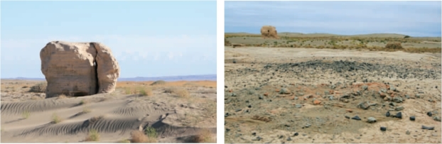 土墩子井窑址群 位于金塔县羊井子湾乡双古城村东北8.6 千米处的沙滩与风蚀台地之中。在东西宽215 米,南北长380 米,面积81700 平方米的范围内发现窑址31 座,窑底平面多呈圆形、方形、葫芦形、山形等。直径在3.6 米~3.9 米之间,灰层厚0.1 米~0.3 米。有部分窑底保存的烟道清晰。在窑址群周围地表有大量的残砖、烧结釉渣、红烧土、烧结碎铁块和素面、网纹、麻点纹灰陶残片,并有少量的粗砂红陶片。为汉代制陶窑址。