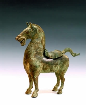 骏马在中国古代是作战、运输和通讯中最为迅速有效的工具,强大的骑兵也曾经是汉朝反击匈奴入侵,保持北部地区安定必不可少的军事条件,所以汉人对马的喜爱超过了以往的任何一个朝代,并把骏马看作是民族尊严、国力强盛和英雄业绩的象征。尤其是天马在汉代具有崇高的政治象征意义。汉武帝为维护和加强自己的统治,极力敦促臣民向“天马”神袛顶礼膜拜,在全国掀起了“马图腾”的热潮。汉武帝《西极天马歌》云:“天马来兮从西极,经万里兮归有德,承灵威兮降外国,涉流沙兮四夷服”。其实,天马自古以来就是河西走廊土著居民崇拜的图腾。因此,大量骏马的形象出现于汉朝雕塑和工艺作品中。在汉代的古墓葬中出土的青铜马制品也不乏少见。尤其是1969 年出土于甘肃省武威雷台墓中的东汉铜奔马,是这一时期铜马艺术品中罕见的精品,被定为中国的旅游标志。