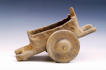 金塔县博物馆收藏的这件陶轺车藏品,是1987 年县文物普查队在青沙梁墓群普查时采集,质地为灰陶,形似推车,双轮,双辕,车厢和车轮可以分离,此车长39 厘米,宽16.9 厘米,整车高20 厘米,重2.47 千克。从墓葬形制推断应属魏晋时期的随葬品。此车质地坚硬,结构轻灵,虽作为冥器葬入墓中,但为我们研究汉代的舆服制度和复原汉代的轺车,提供了极为难得的实物资料。甘肃省文物局鉴定为国家二级文物。