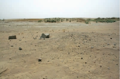 细腰2 号破庄子遗址,位于大庄子乡牛头湾村东北14.6 千米处,东距细腰墩1 千米处的一片开阔的黄土地上,遗址分布南北长300 米,东西宽200 米,总面积60000 平方米,遗址中心有一新月形沙丘横卧。地表有大量黑釉瓦片、花岗石块、青花瓷碗残片。第二次全国文物普查时中心有夯土墙和土坯砌筑房屋遗址,现已被沙丘掩埋,为清代民居遗址。该遗址为研究我县清代历史文化及民居分布提供了实物依据。