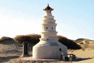 小叉庙,位于金塔县古城乡上东沟村西1 千米处的沙漠中。初建年代约为清乾隆二十八年(1763年) 左右。有庙宇一座,戏台一座。西南角上有土坯覆钵式喇嘛塔一座,当地人叫“陈牙机塔” (实为陈来祝塔),据传为一位得道高人陈真人安其遗躯所建。塔高约有10 米,外抹白灰。5 米以上呈珠形塔式,上顶有水潭覆盖,高1.8 米。四面各辟一龛,高0.25 米,宽0.15 米,深0.51 米。顶端挂有四个风铃。底部为圆形,直径6 米。20 世纪30 年代,由于大风吹动沙丘前移,小叉庙及陈来祝塔均被沙漠埋压。