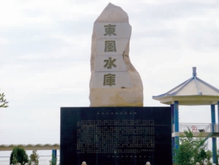 东风水库原名为“五一水库”,始建于1960 年4 月,1962 年9 月投入使用。水库位于东风场区西南约7000 米处,占地面积8.5 平方千米。这是一座旁引屯蓄式湖泊水库,水库大坝长1796 米,库容1800 万立方米,主要水利设施有黑河引水枢纽、2.8 千米的引水渠道和7 千米长的灌溉渠。东风水库是基地官兵为了改善恶劣的自然环境,确保基地生态平衡而建造的,它是荒漠戈壁中一处独特的景观。