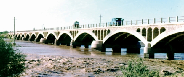 新中国成立以后,党和政府非常关心金塔鼎新人民的疾苦,采取了一系列科学办法综合治理黑河。首先在黑河边上修了许多小型水库,调节和控制了黑河水量。1974 年,国家又拨款70 万元,修建黑河大桥。建桥过程中,金塔人民和工程技术人员一起,克服困难,战胜洪峰,运用先进科学技术,圆满地完成了施工任务。仅用了九个月的时间,一座空腹式钢筋混凝土双拱大桥便凌空飞架!
