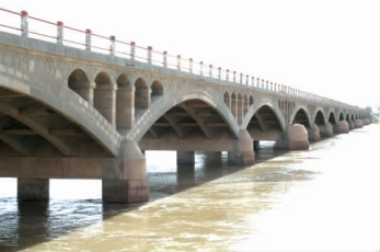 鼎新黑河大桥建于1975年,总投资70 万元。大桥全长335.6 米,桥面净宽7 米。设计净跨20米、15 孔等截面圆弧空腹式钢筋砼双曲拱桥。上部结构为五肋四坡,由75 根腹拱跨度1.65 米的拱肋组成。下部结构采用三柱式钢筋砼灌注桩基,每三孔设制动墩(即双排六柱),由68 根钢筋砼灌注桩组成16 个墩台,深15 米。紧靠桥台上下游,各有两道浆砌片石导流坝,长达265 米。大桥两端,土坝引伸长达2.4 千米,并筑护坝截水墙,拦水入桥。坝顶用卵石、沙砾铺砌,焦油罩面。
