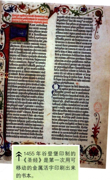 早期的东亚印刷工匠们并没有使用印刷机,他们只是将纸铺在涂好墨水的印版上,用刷子或滚筒按压使纸和印版充分接触。大约1442年,谷登堡在法国的斯特拉斯堡制造了他的第一台印刷机,但是在1450年左右,谷登堡回到了位于德国的家乡美因茨。在商业伙伴德国富商约翰·富斯特和德国印刷工匠彼得·舍费尔的出资帮助下,谷登堡建起了印刷厂。1455年,谷登堡与他的新合作伙伴康拉德·休姆利一起印刷了第一部书,同时也是世界上第一部使用可移动金属活字印刷的书,这就是拉丁译本的《圣经》,因为每栏均为42行,也称为《四十二行圣经》。如同当时的其他出版物一样,这本书没有页码,没有扉页,也没有任何关于出版人的信息。1457年,舍费尔出版了《圣经·旧约》中的诗篇,这是欧洲第一部带有出版人姓名的书籍,同时也是第一部使用两种颜色印制的书籍。