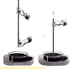 再现托里拆利的实验非常简单,把一根一段封闭的玻璃管中倒满水银,再把开口的一段浸入装有水银的容器里,这时玻璃管中的水银柱会缓慢下降,在玻璃管中形成一段真空区域。