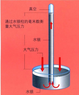 容器中水银所受到的大气压力支撑起玻璃管中的水银,使之不至于完全倒流到容器里。玻璃管中水银表面上方的真空区域的高度变化所反应的就是大气压力。