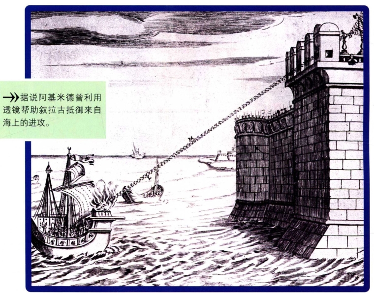 光线在穿过透镜的时候会发生弯曲,然后聚焦。由于放大镜有汇聚光线的作用,因此放大镜可做取火之用。公元前212年,传说古希腊科学家阿基米德通过放大镜点火摧毁了攻击锡拉库扎的罗马战船。
