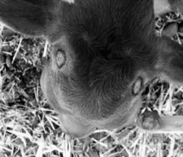(2)氢氧化钠去角:将犊牛的角周围3cm 处进行剪毛,并用5%碘酊消毒,周围涂以凡士林油剂,防止药品外溢流入眼中或烧伤周围皮肤,将氢氧化钠与淀粉按照1.5∶1 的比例混匀后加入少许水调成糊状,带上防腐手套,将其涂在角周围约2cm 厚,在操作过程中应细心认真,如涂抹不完全,角的生长点未能破坏,角仍然会长出来,一般涂抹后7 天左右,涂抹部位的结痂会自行脱落。应用此法,在去角初期应与其他犊牛隔离,防治其他犊牛舔舐,烧伤口腔及食道;同时避免雨淋,以防苛性钠流入眼内或造成面部皮肤损伤。还可使用氢氧化钠棒去角,经上述常规处理后,用棒状的氢氧化钠在犊牛角基部摩擦,直到出血以破坏角的生长点。一般涂抹后7 天左右,涂抹部位的结痂会自行脱落,也可使用去角灵膏剂进行涂抹去角。