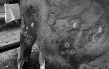 ⑤疥螨、痒螨症脱毛:前者脱毛多在头、颈部,后者脱毛多出现于肩、颈及尾根部,患处极痒,病犊常挨近木桩、树干或墙壁擦痒,出血后形成痂皮,皮肤出现皱褶或龟裂,被毛脱落。