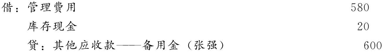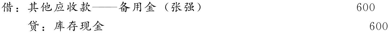 【例2-2】顺达商贸有限公司职工张强出差采购物品,预支备用金600元,出差返回报销差旅费580元,并交回多余现金20元。
