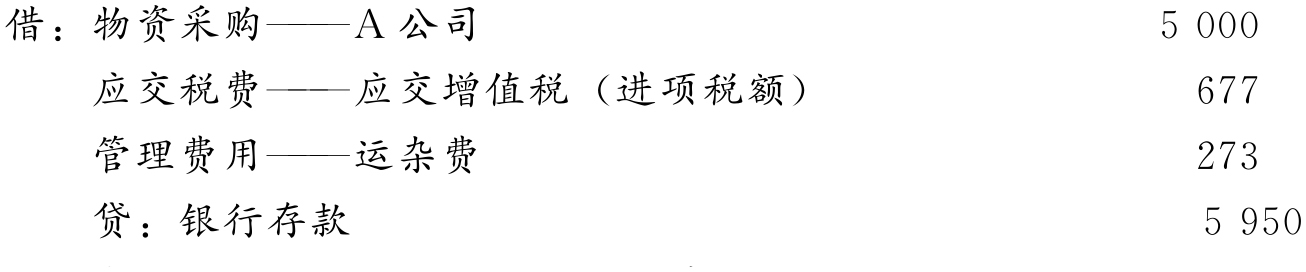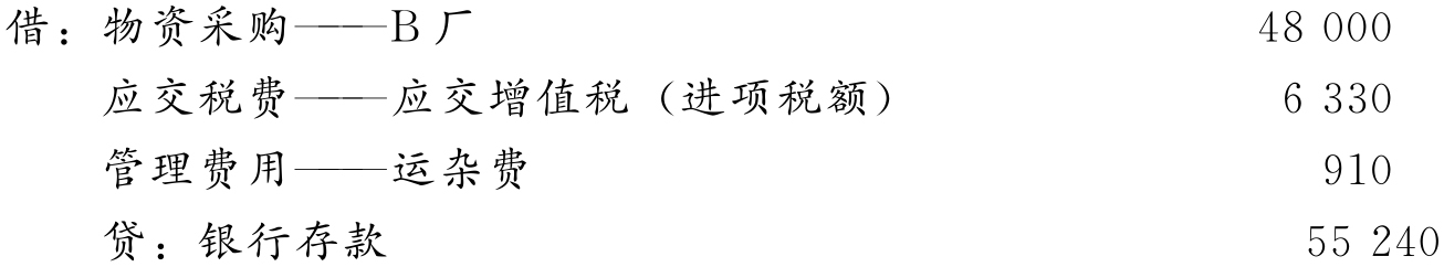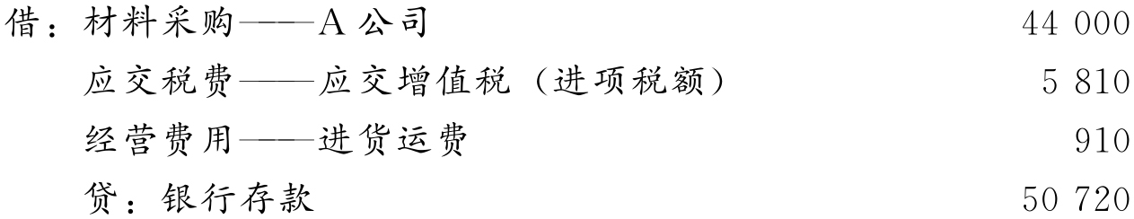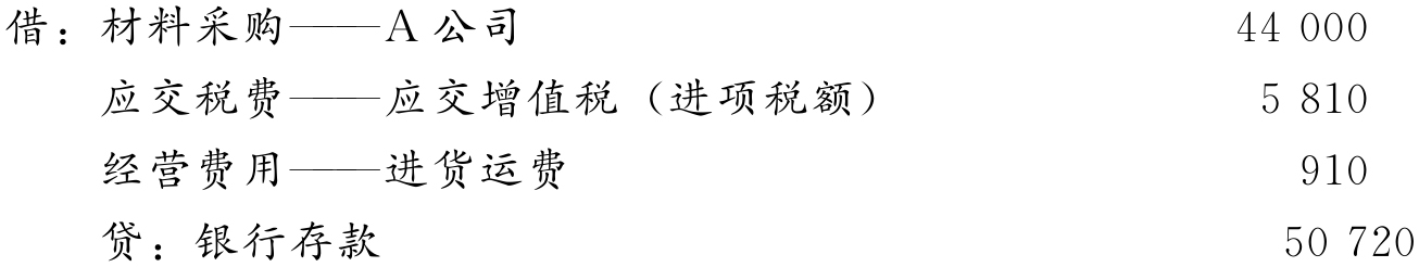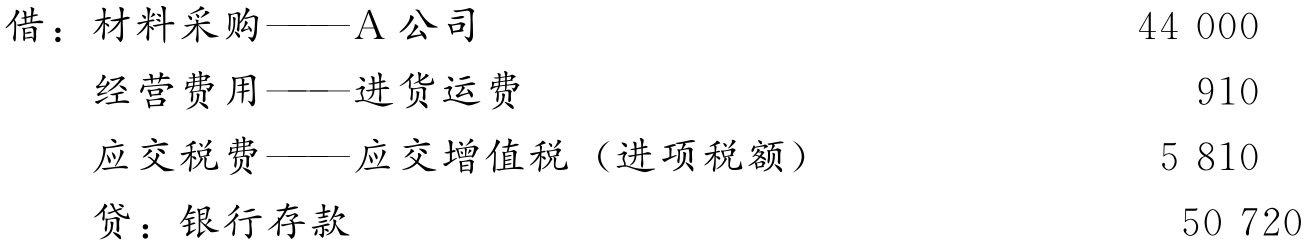 【例4-2】某商业企业向A公司购入香皂20 000块,单价2.20元,进项税率13%,价税共计49 720元,供货单位代垫运费1 000元,货款结算采用“异地托收承付”结算方式。